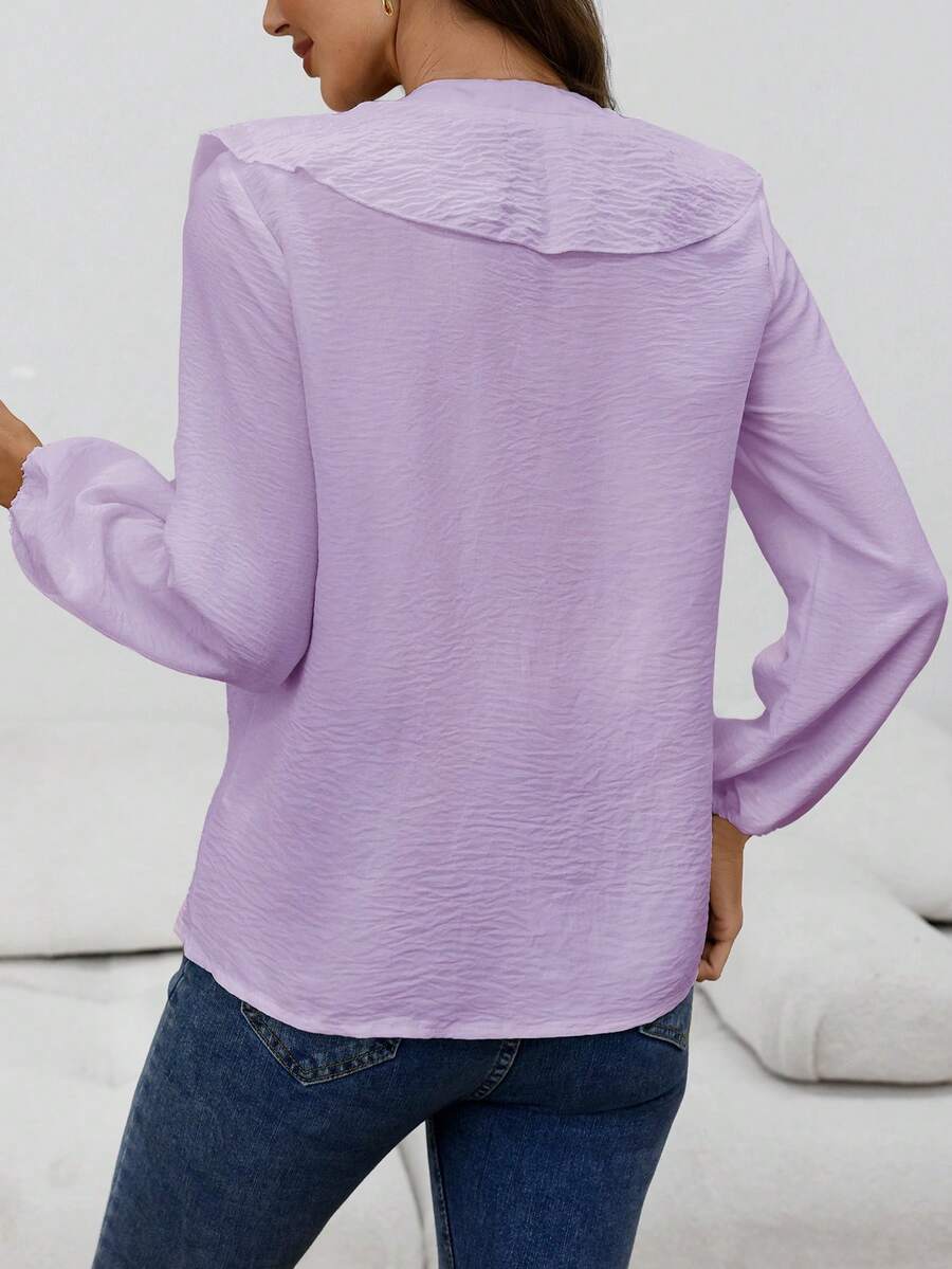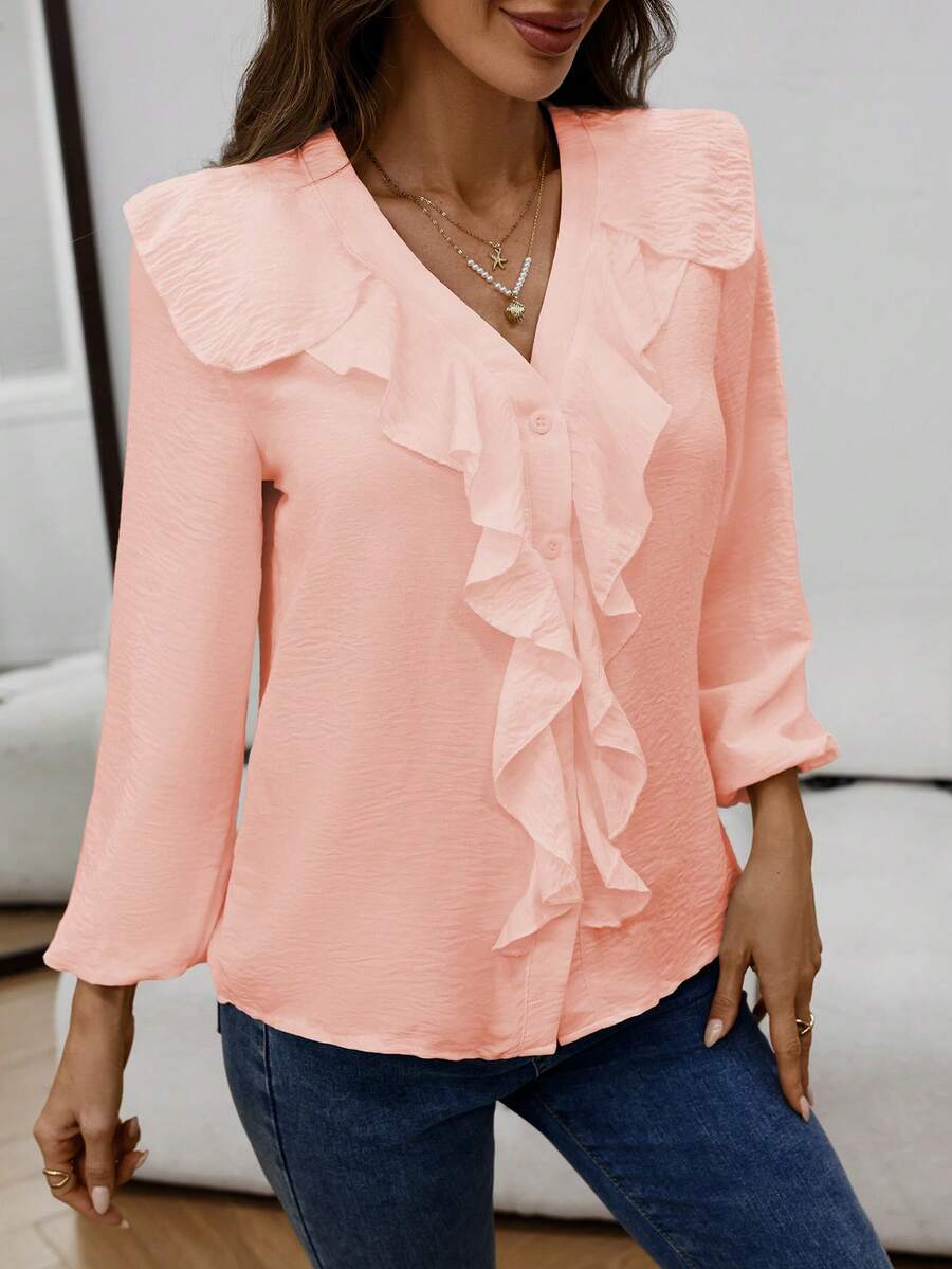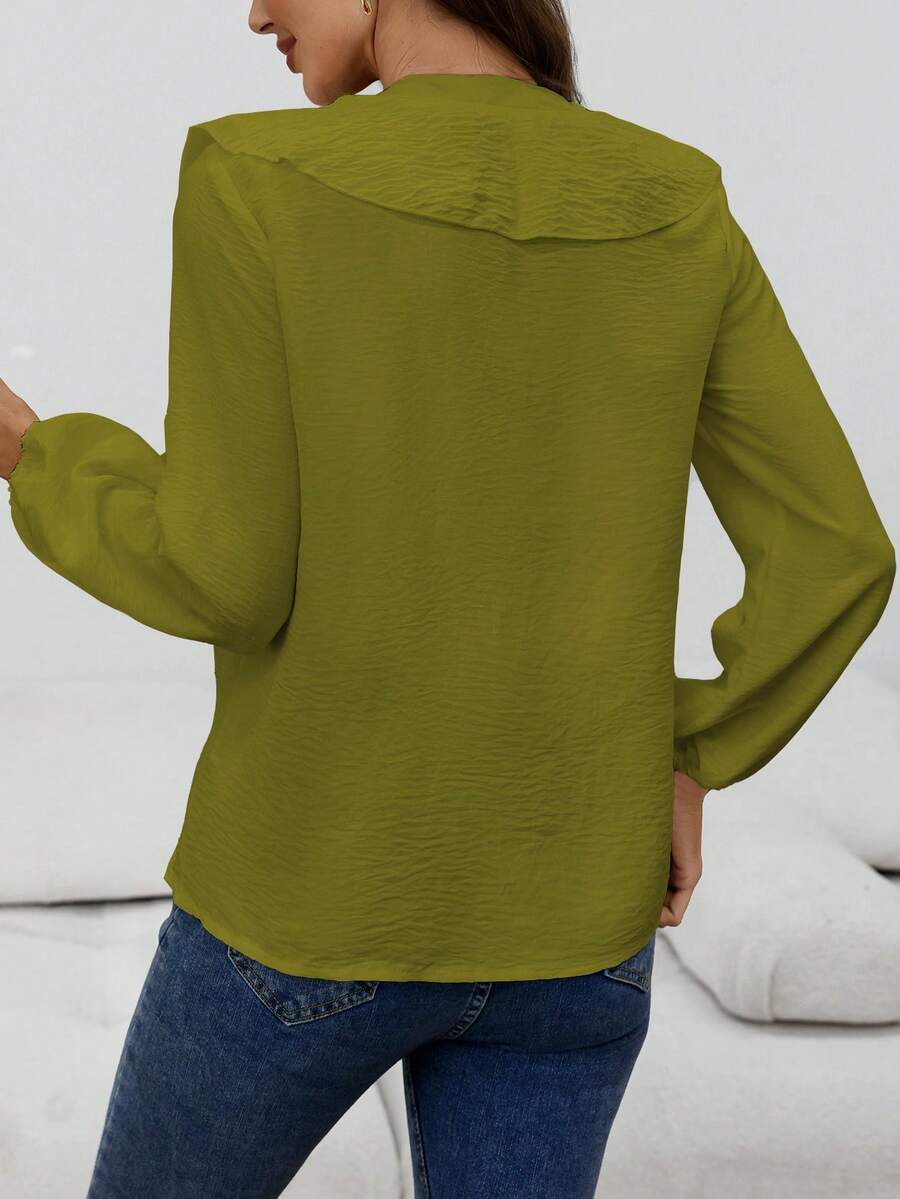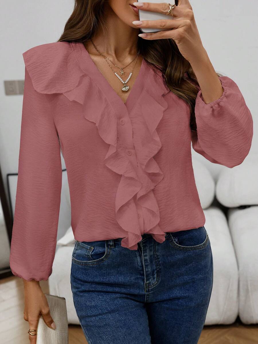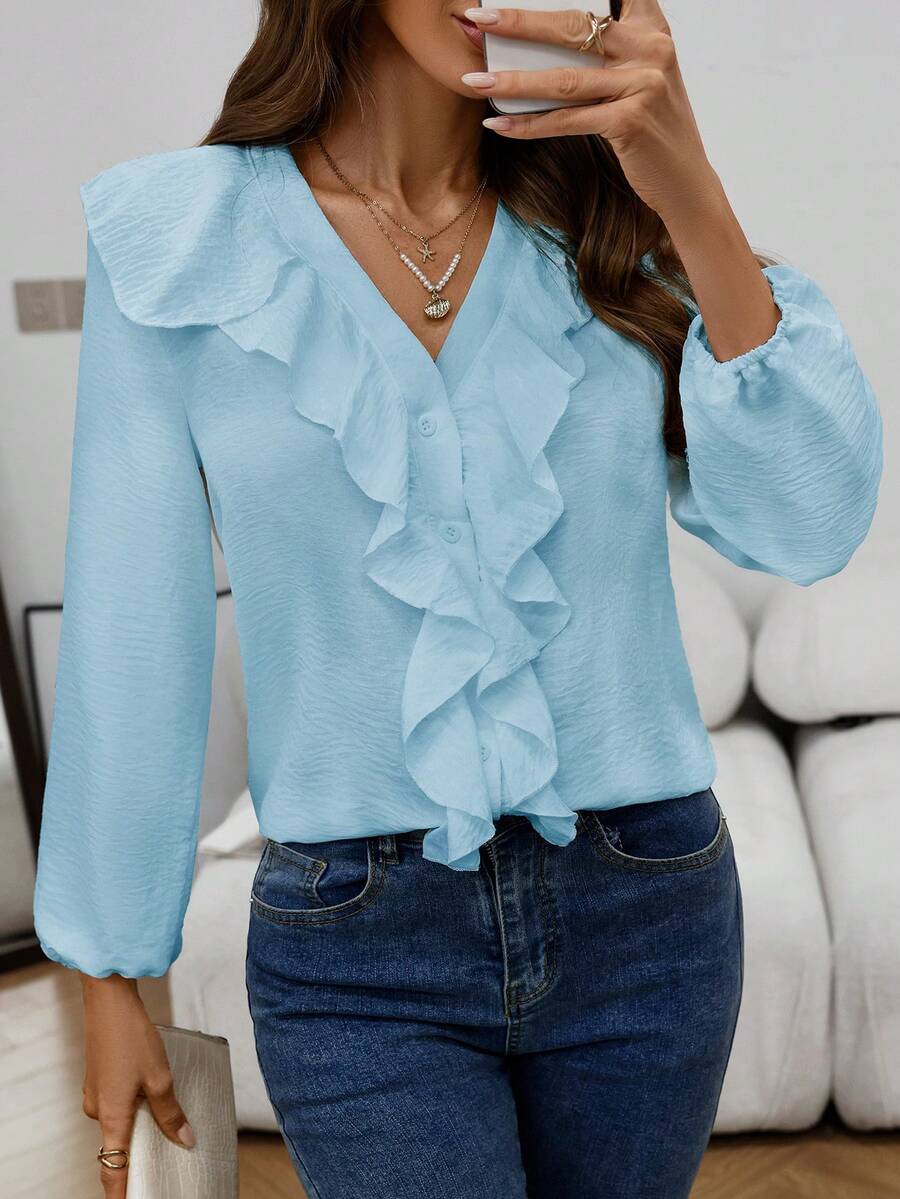Blusa casual com decote em V, manga comprida e bainha com babados