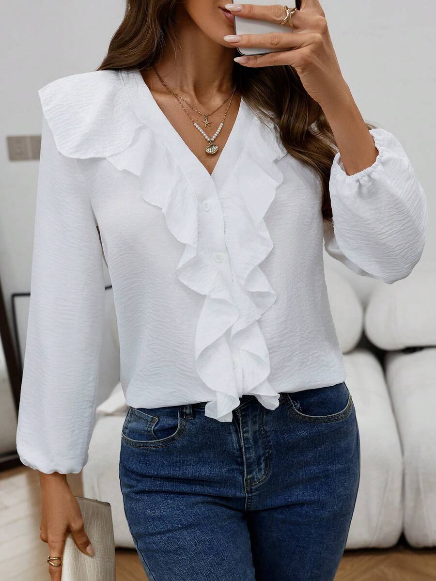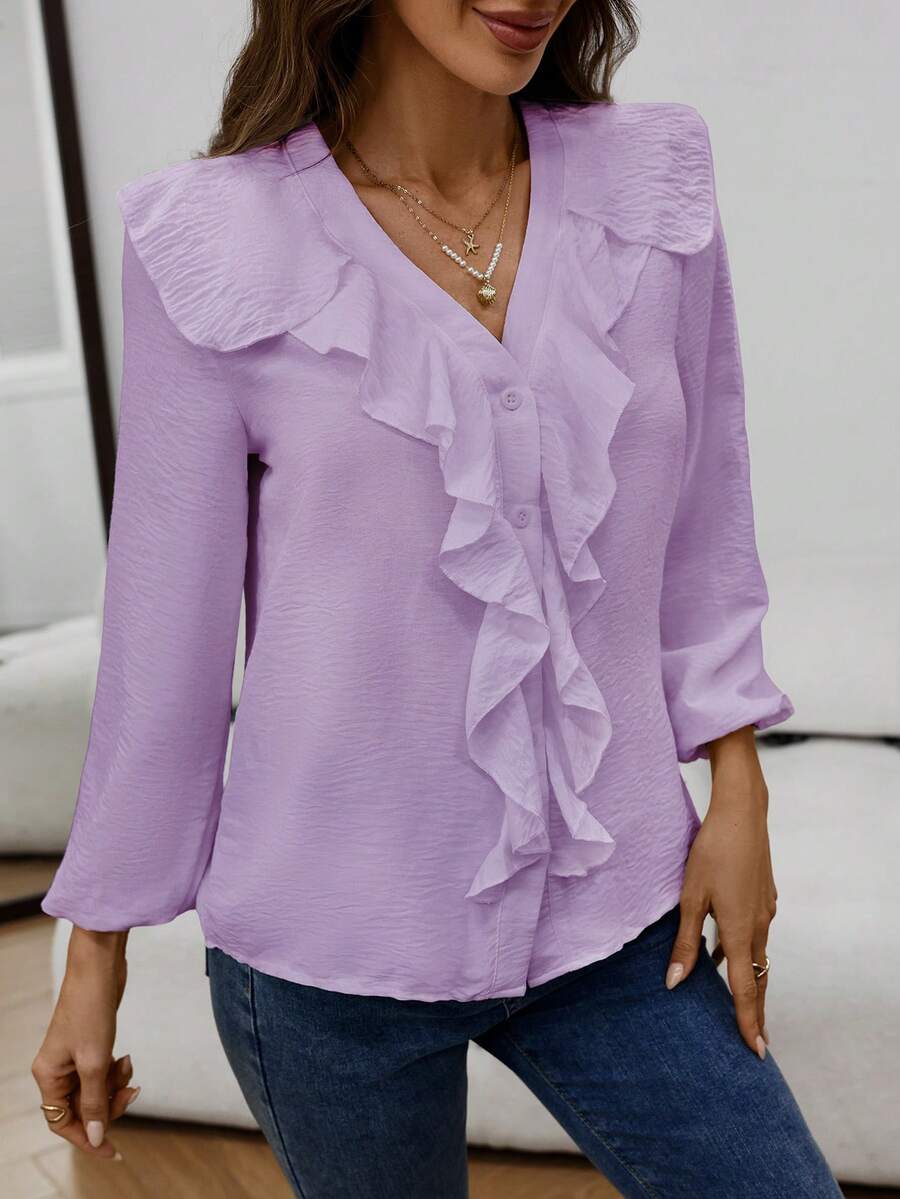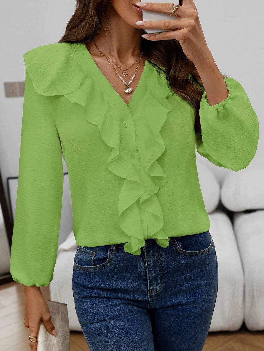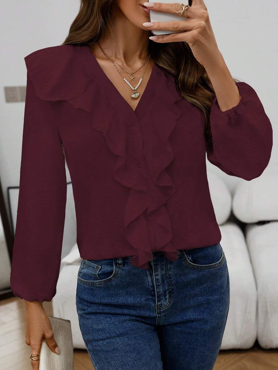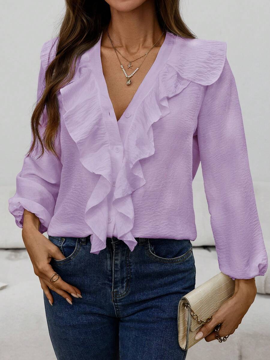 Blusa casual com decote em V, manga comprida e bainha com babados