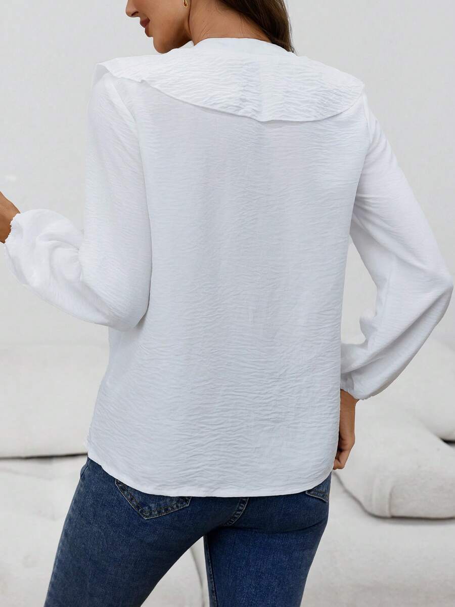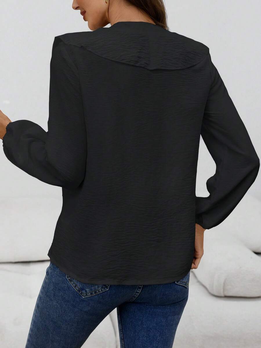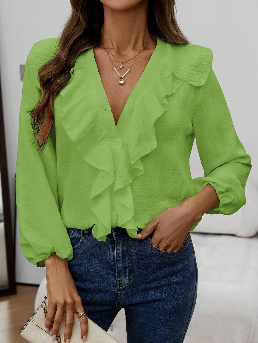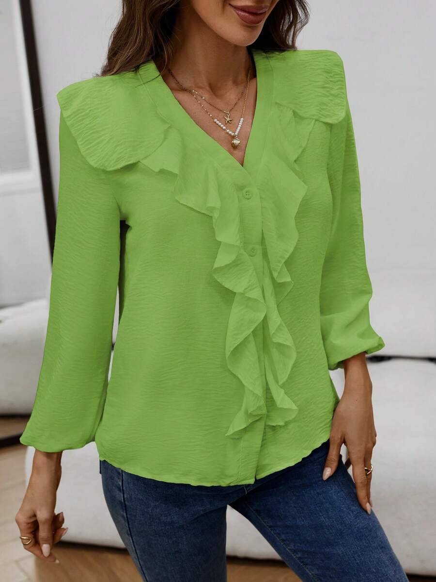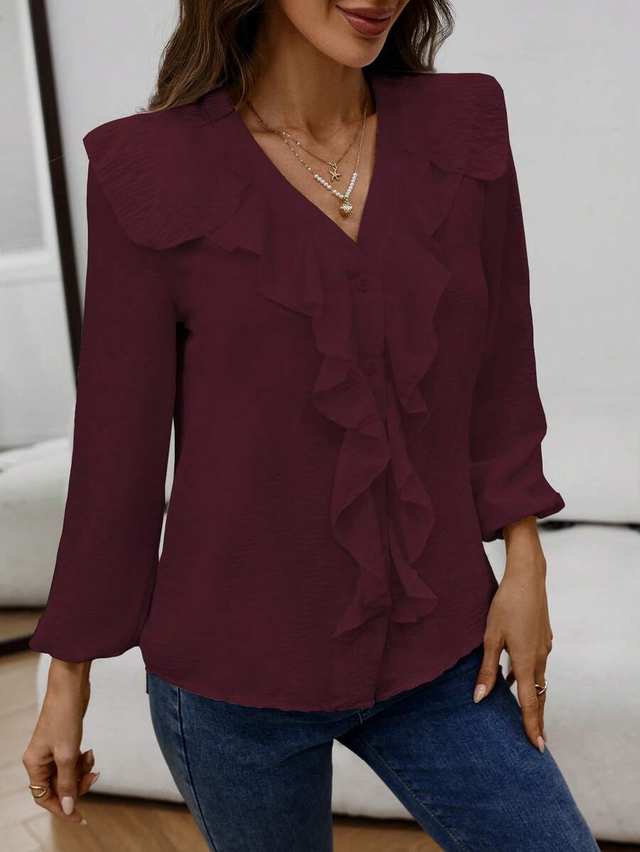 Blusa casual com decote em V, manga comprida e bainha com babados