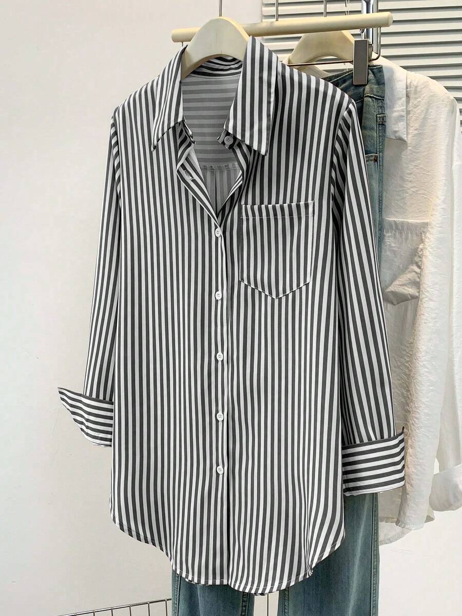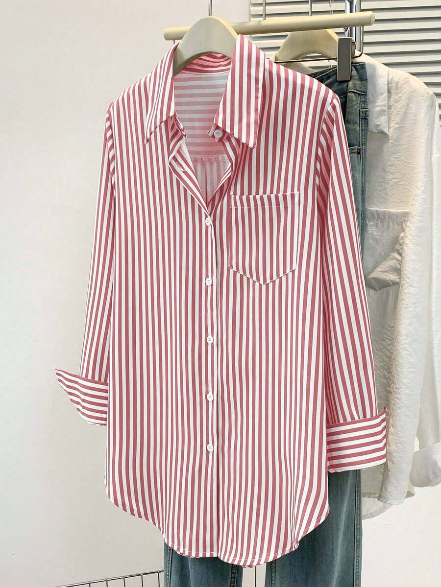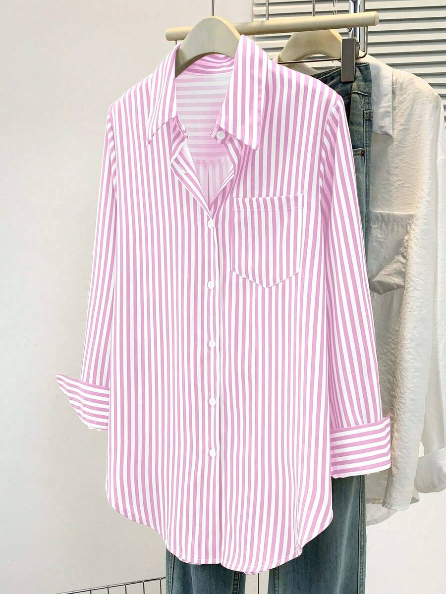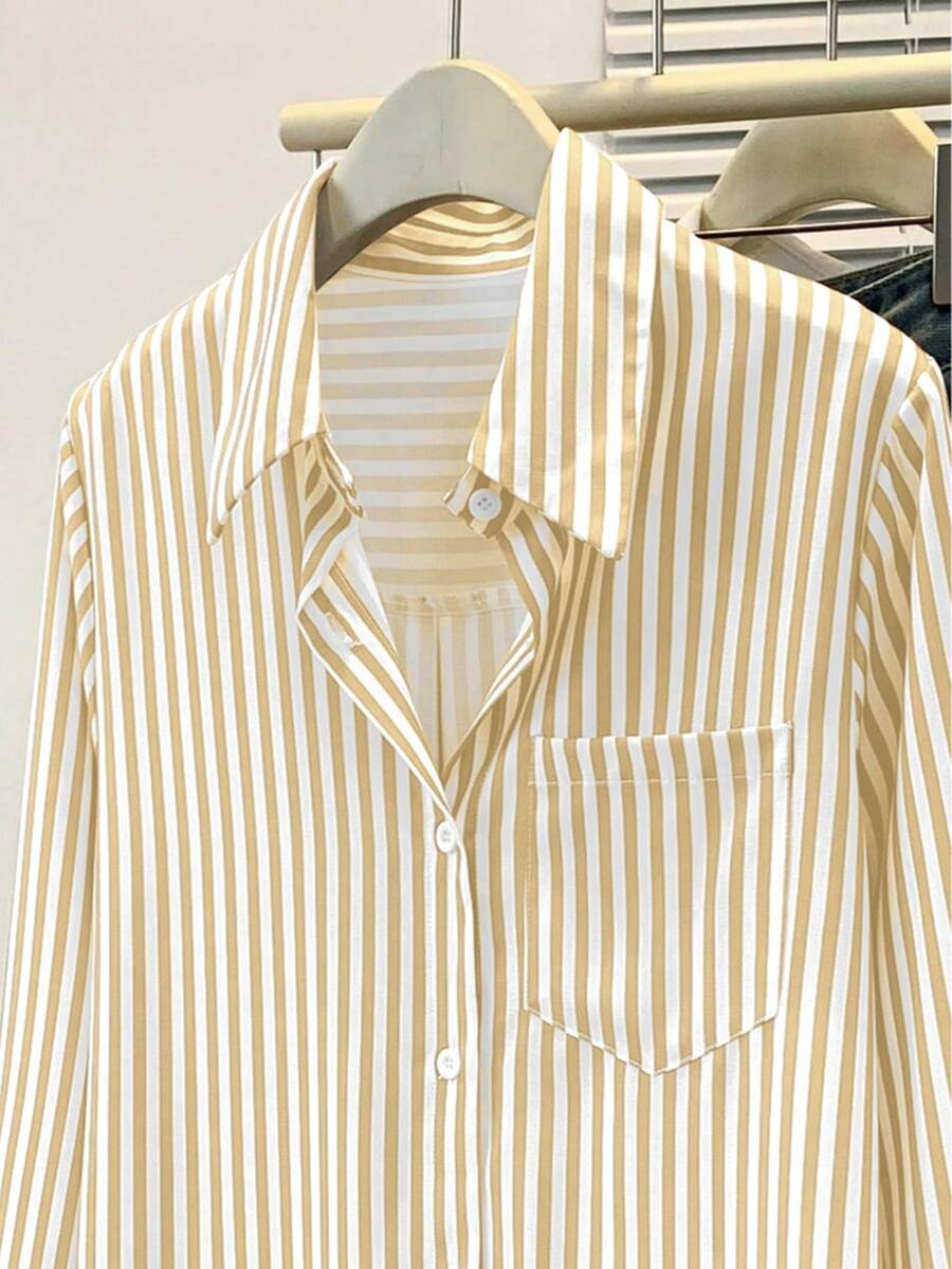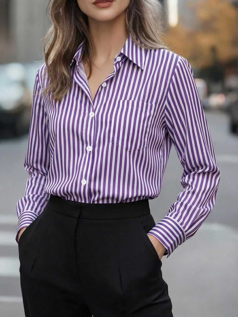 Camisa feminina casual básica listrada com gola pontuda e manga comprida com bolso de botão, roupa de escritório diária para outono e inverno