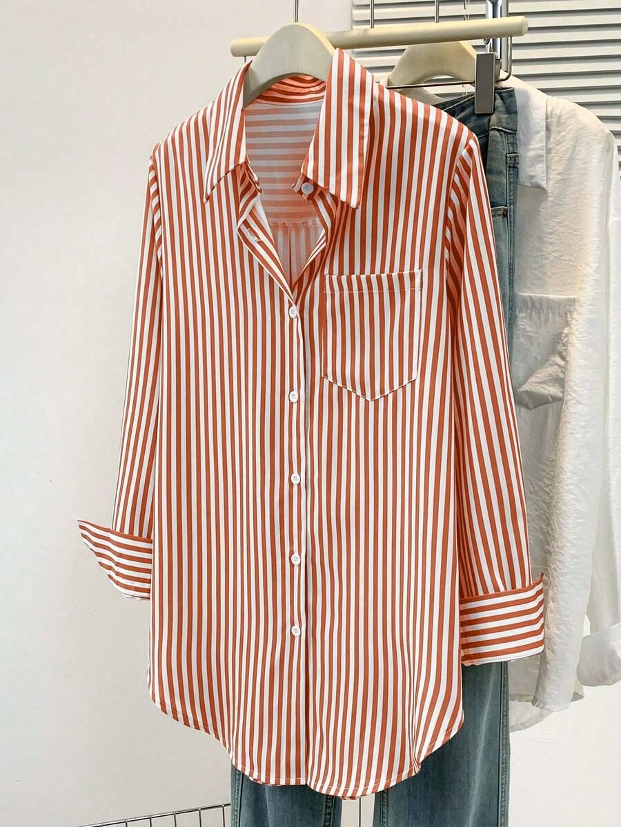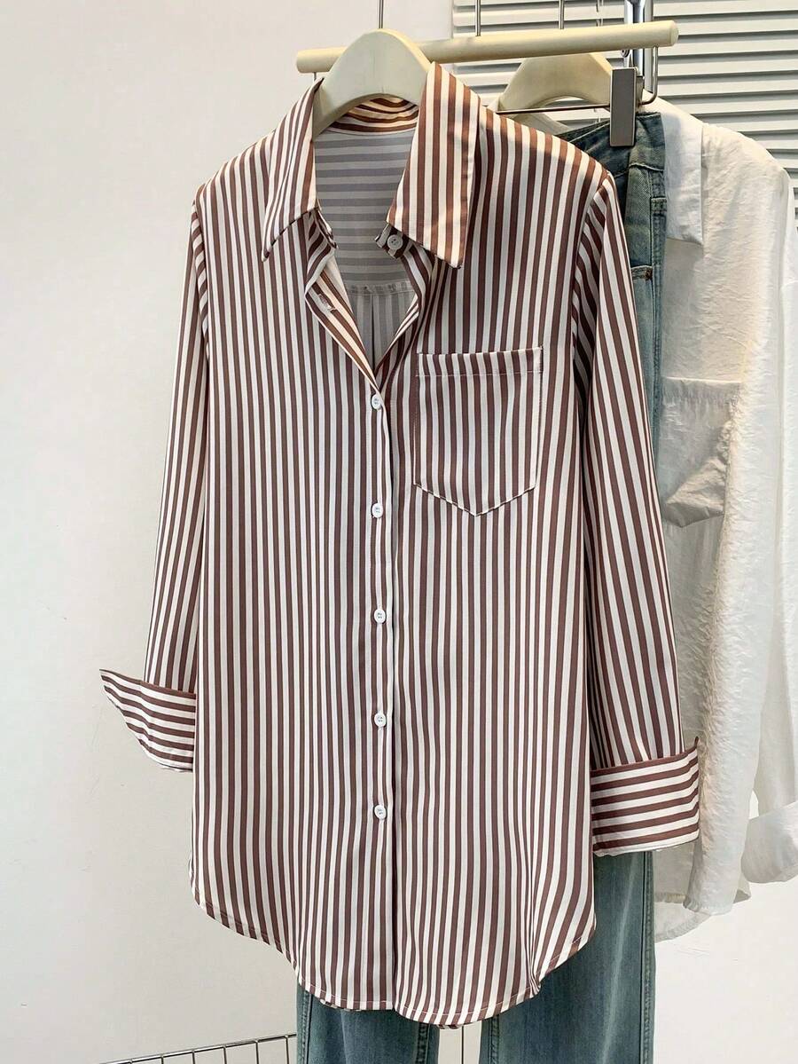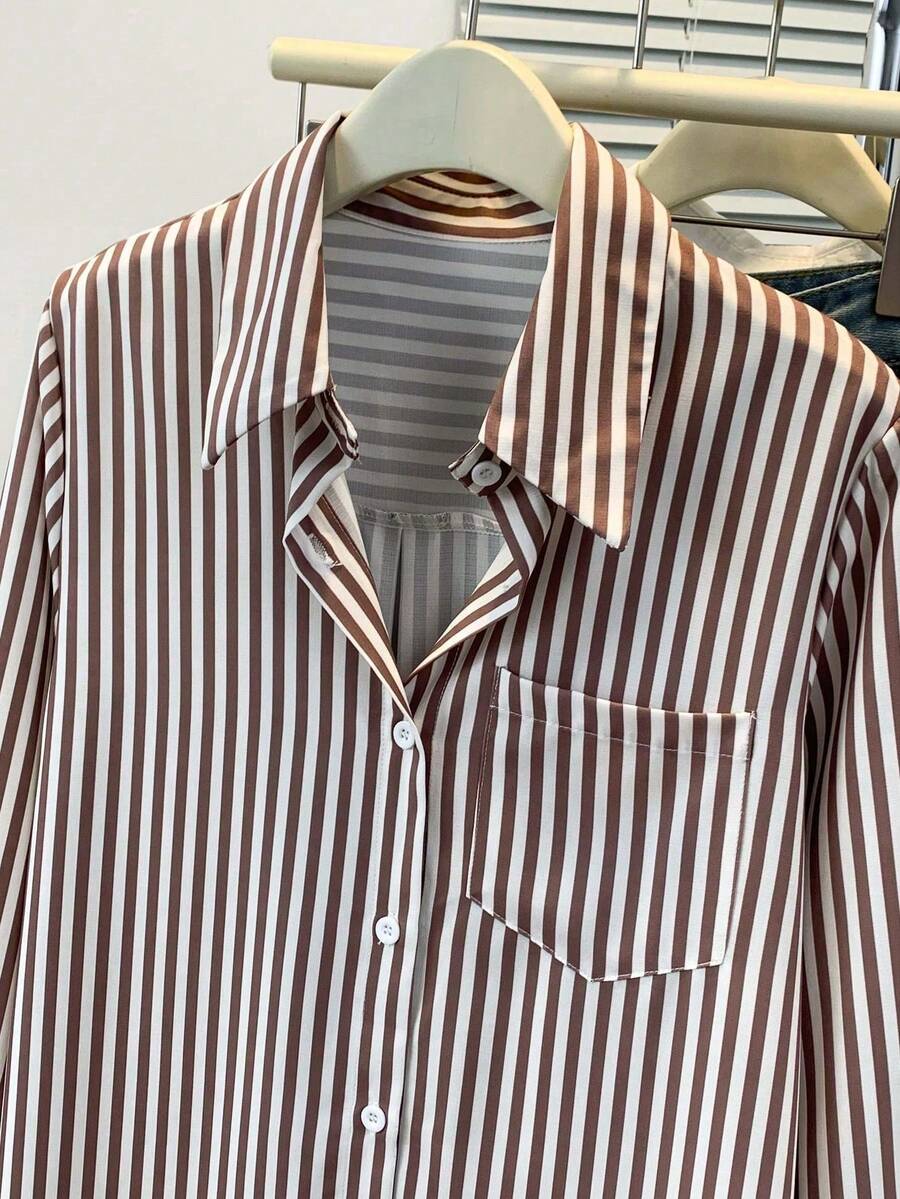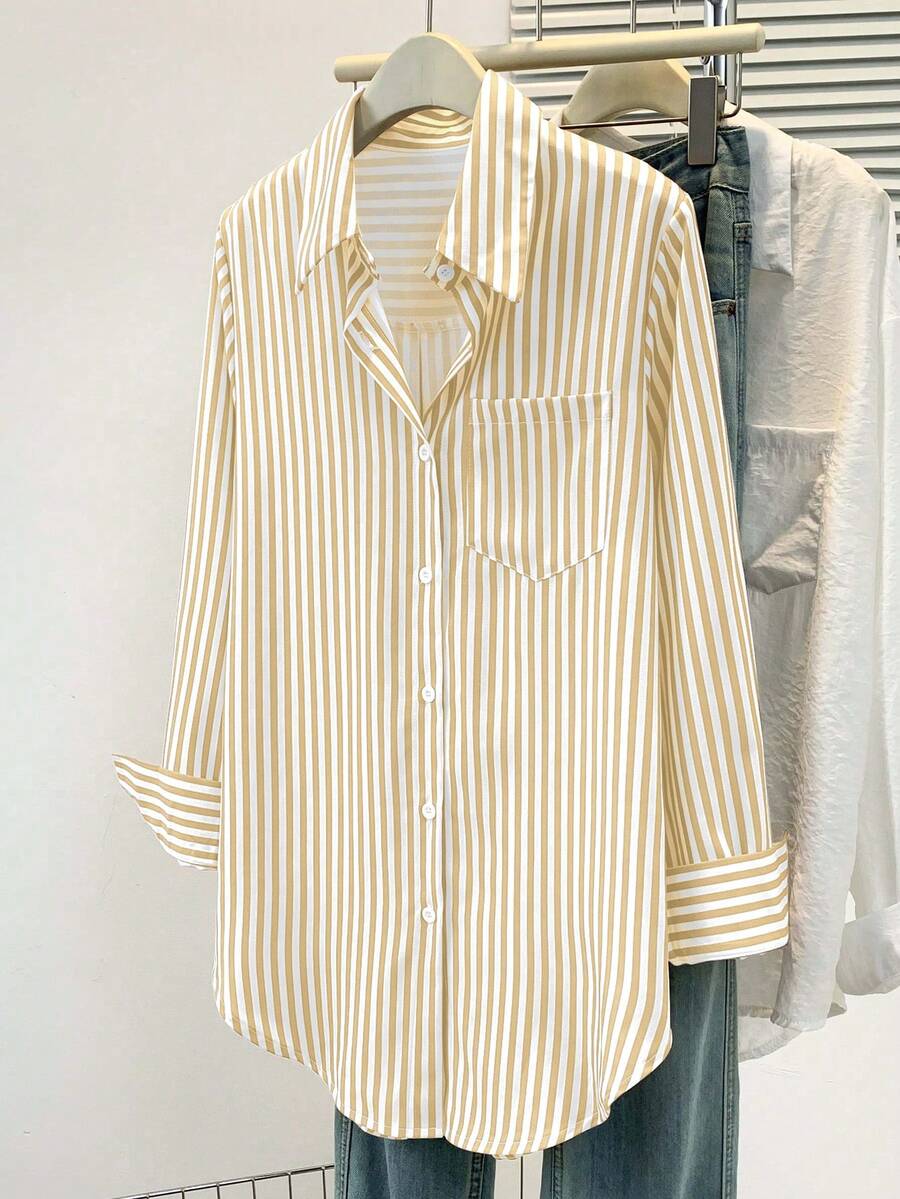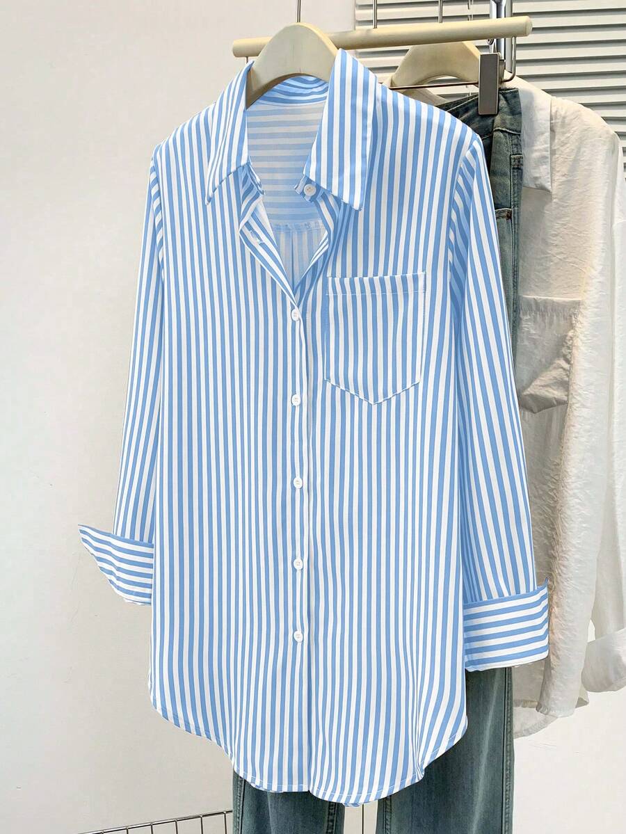 Camisa feminina casual básica listrada com gola pontuda e manga comprida com bolso de botão, roupa de escritório diária para outono e inverno