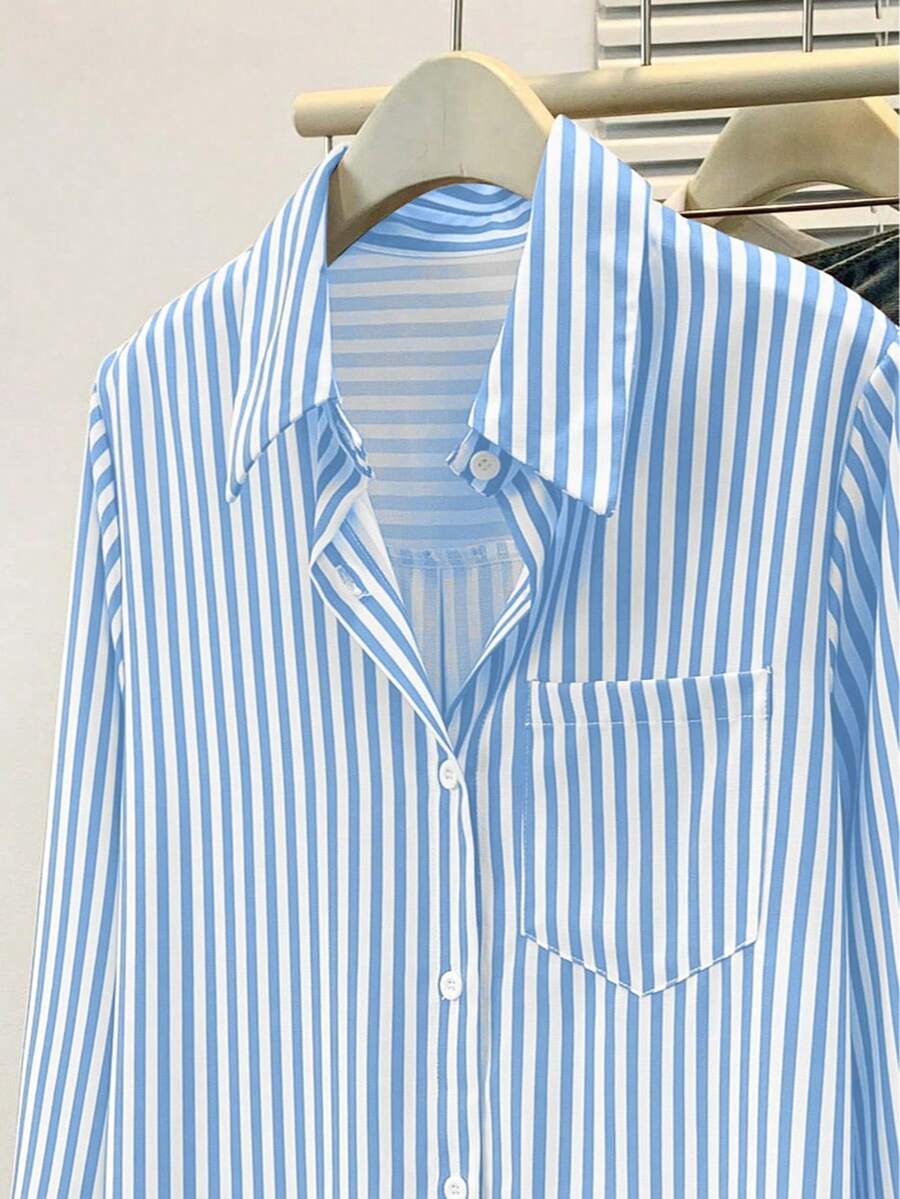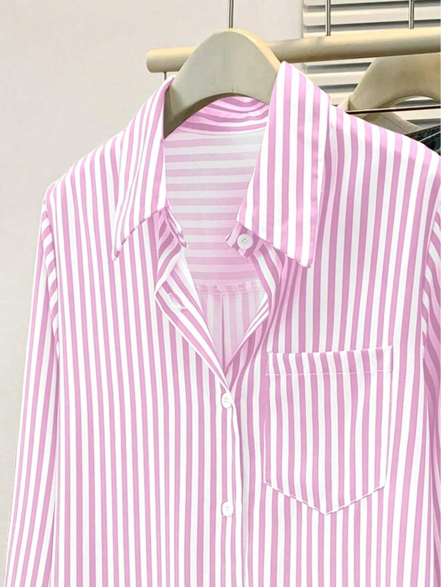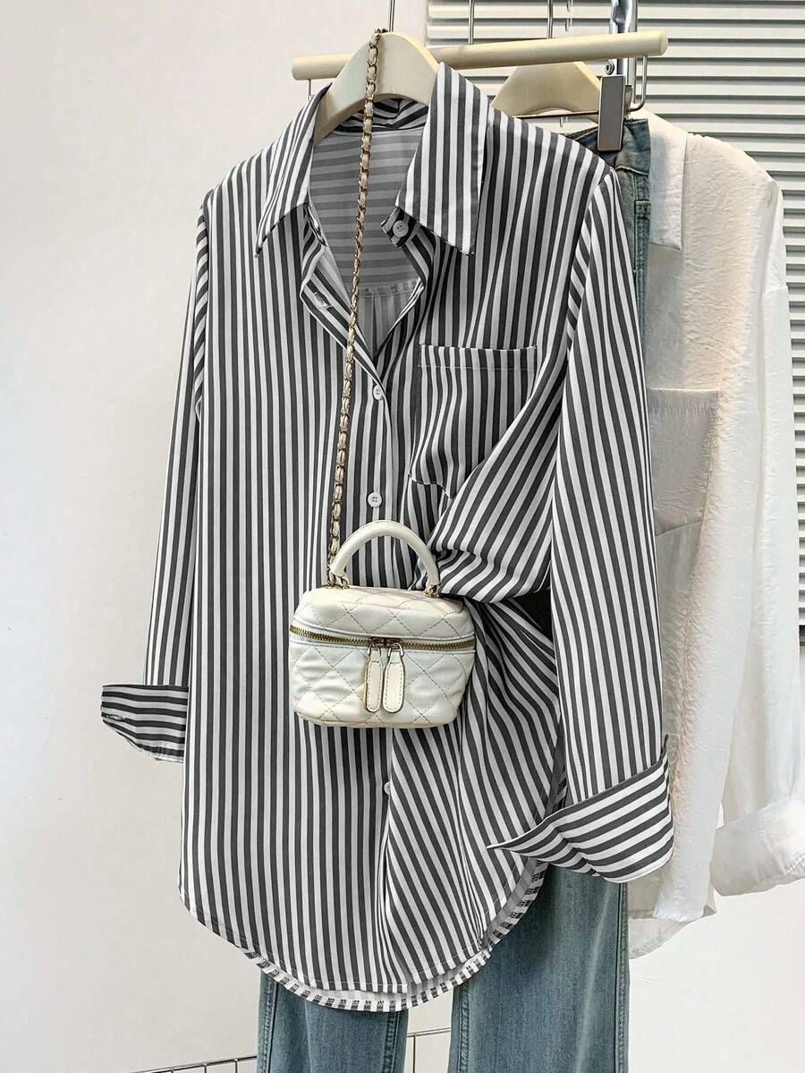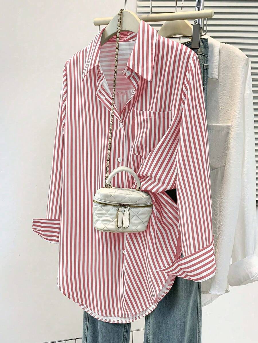 Camisa feminina casual básica listrada com gola pontuda e manga comprida com bolso de botão, roupa de escritório diária para outono e inverno