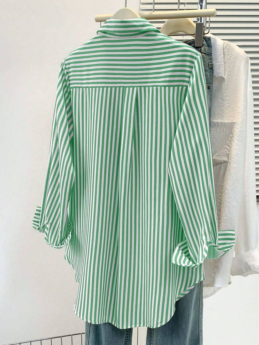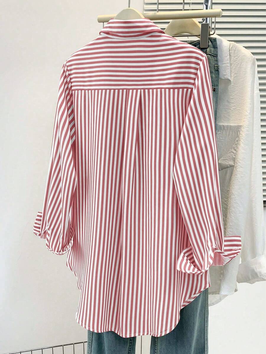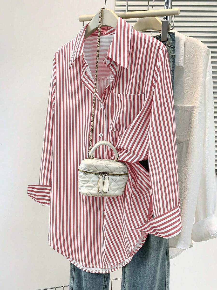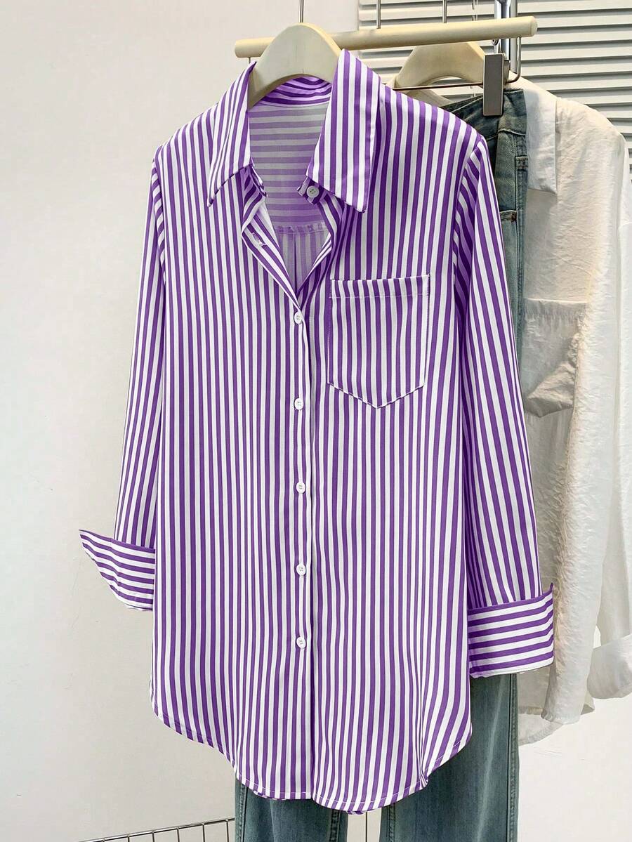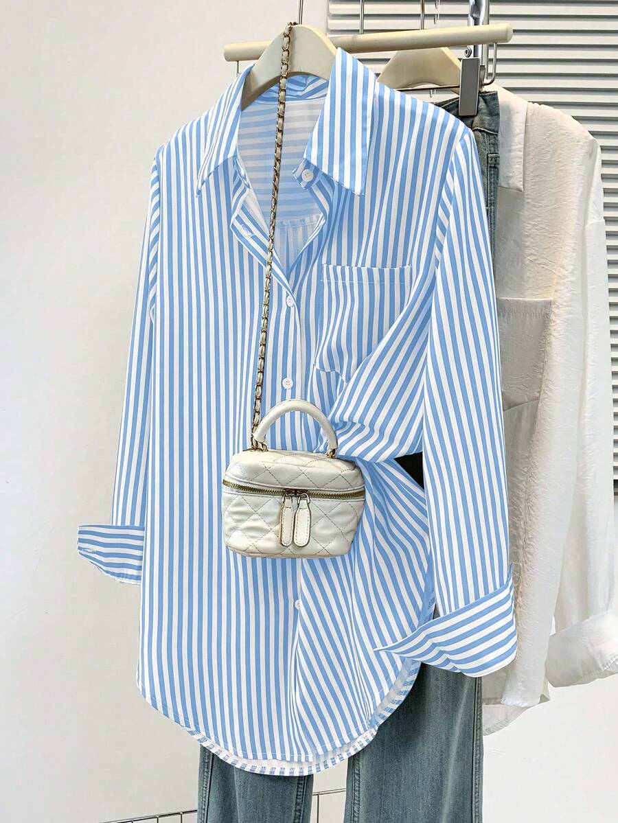 Camisa feminina casual básica listrada com gola pontuda e manga comprida com bolso de botão, roupa de escritório diária para outono e inverno