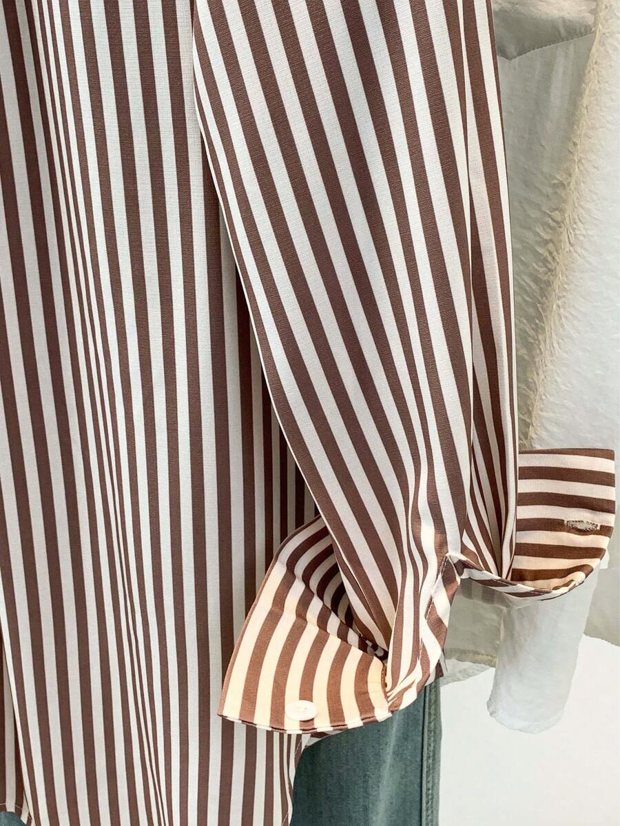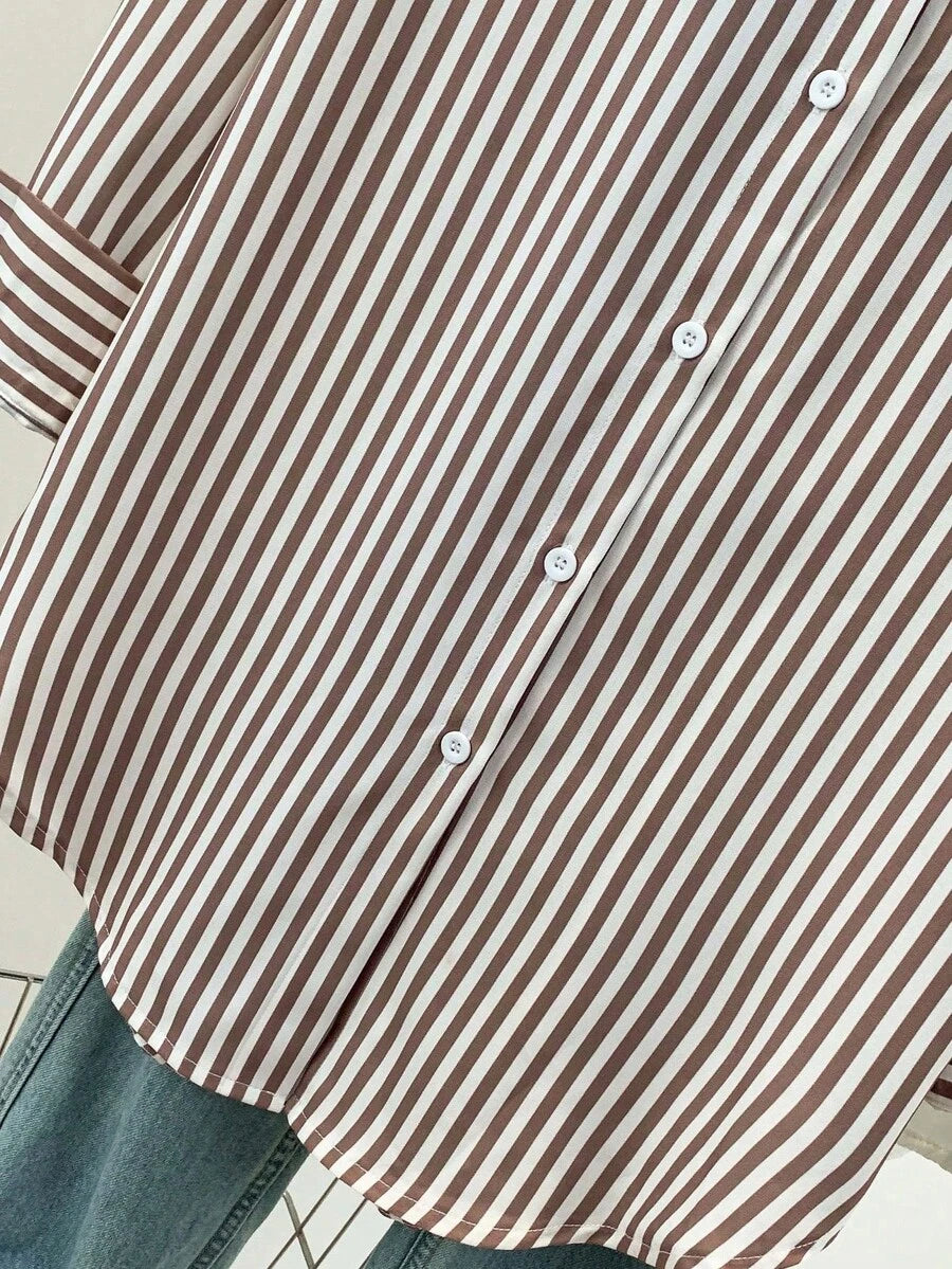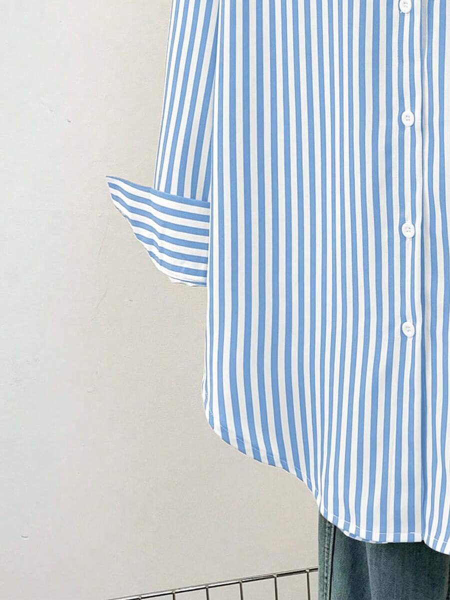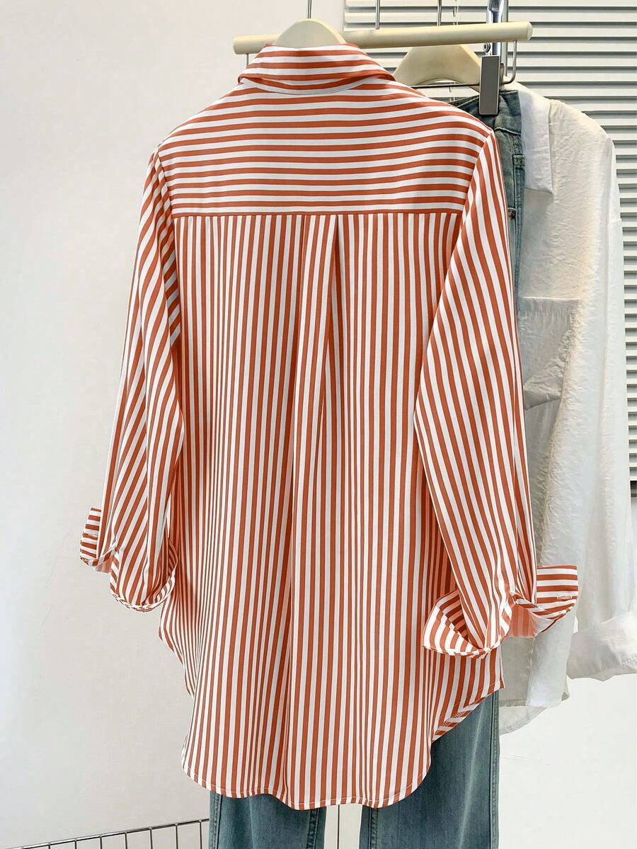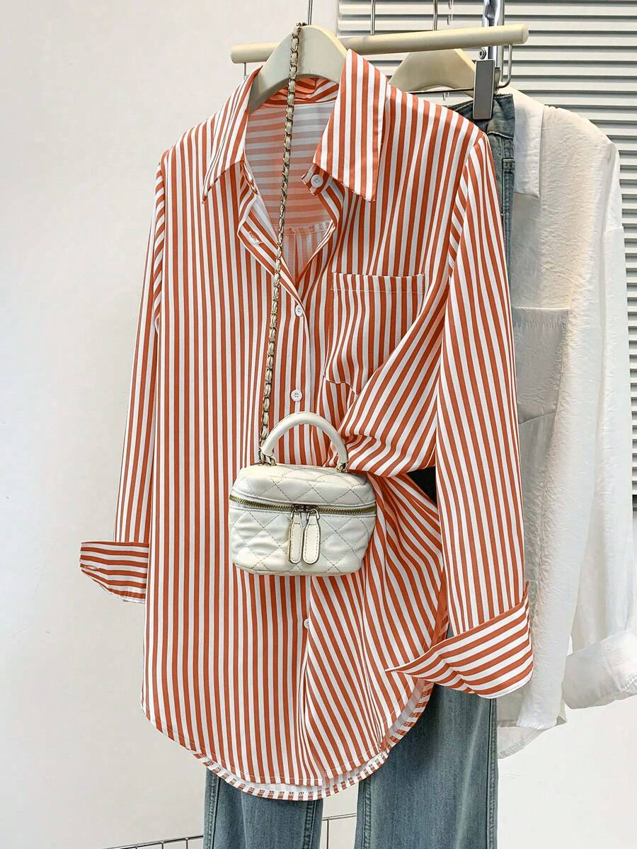 Camisa feminina casual básica listrada com gola pontuda e manga comprida com bolso de botão, roupa de escritório diária para outono e inverno