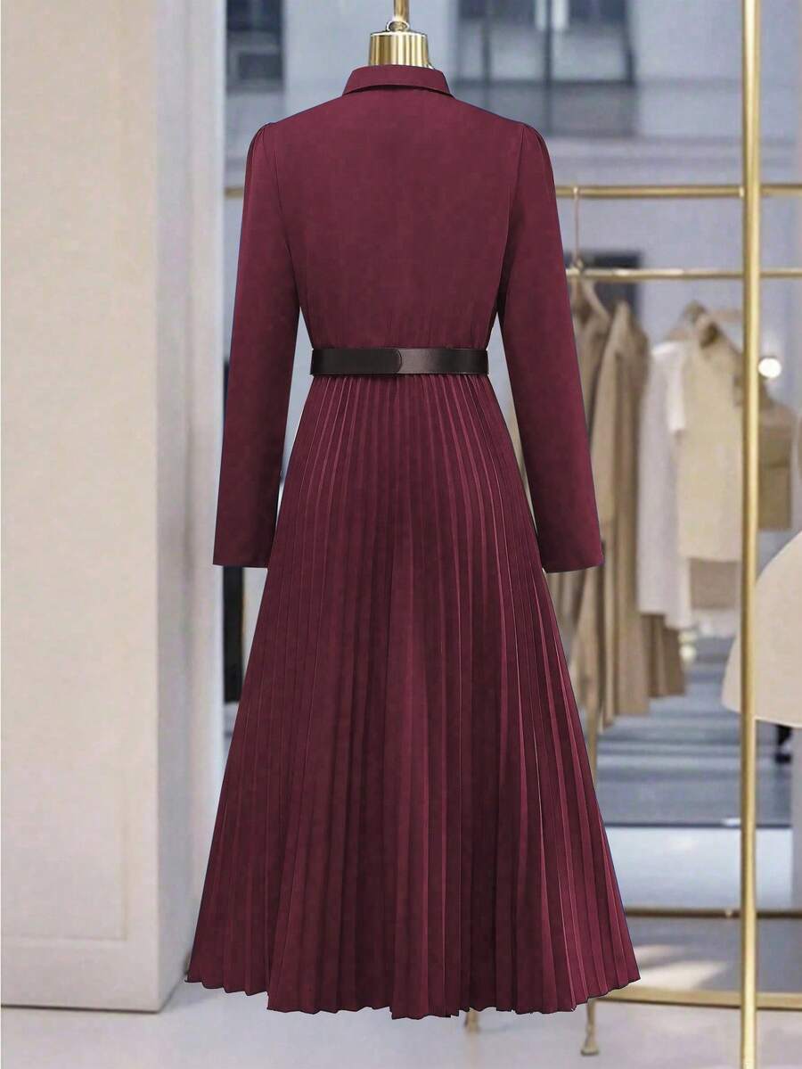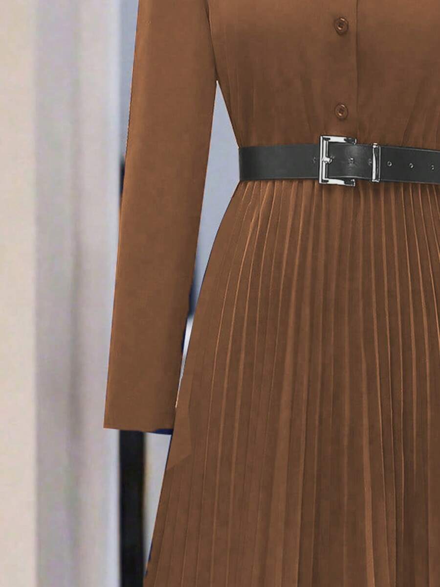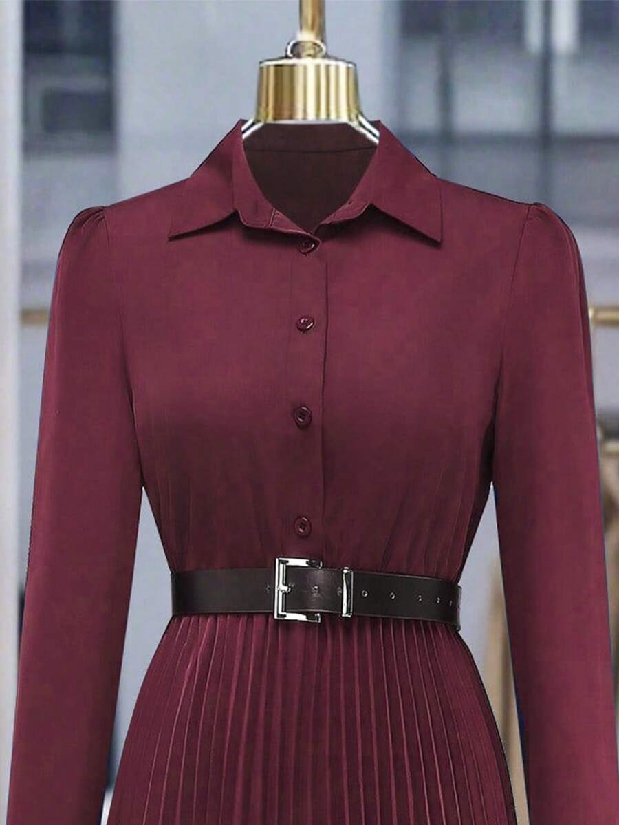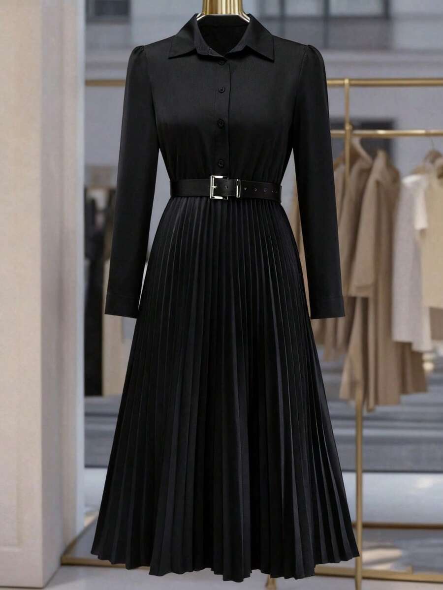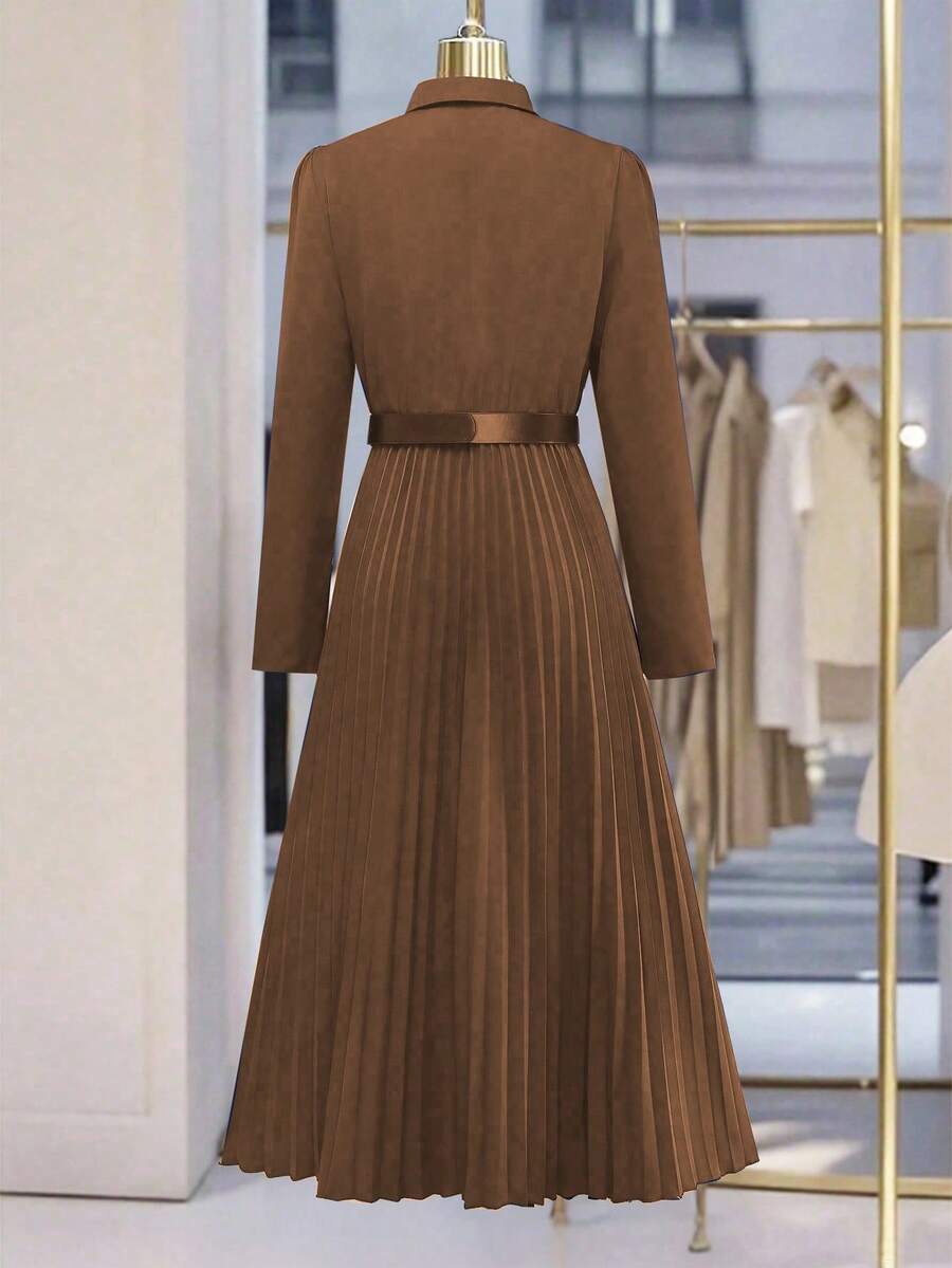 Vestido-camisa feminino elegante, plissado, de manga comprida e botões (cinto não incluído), outono
