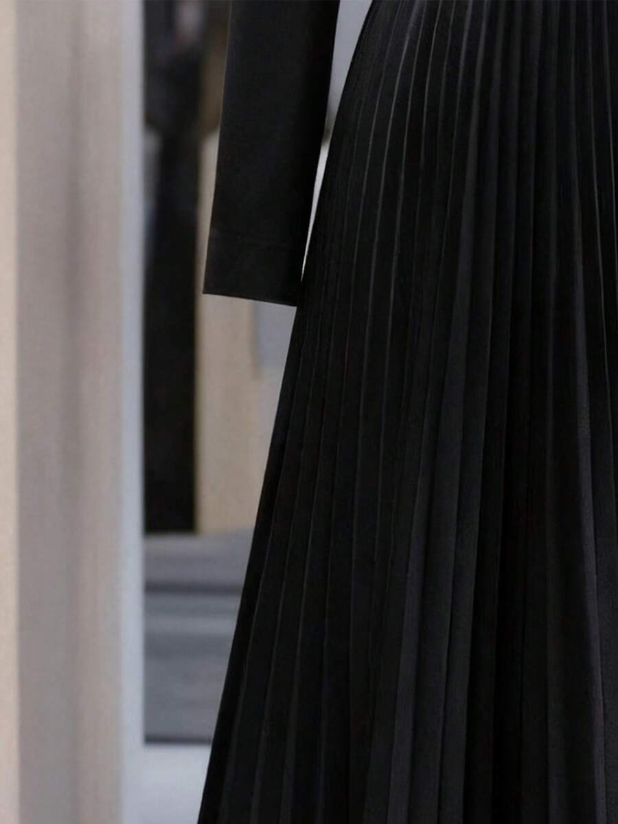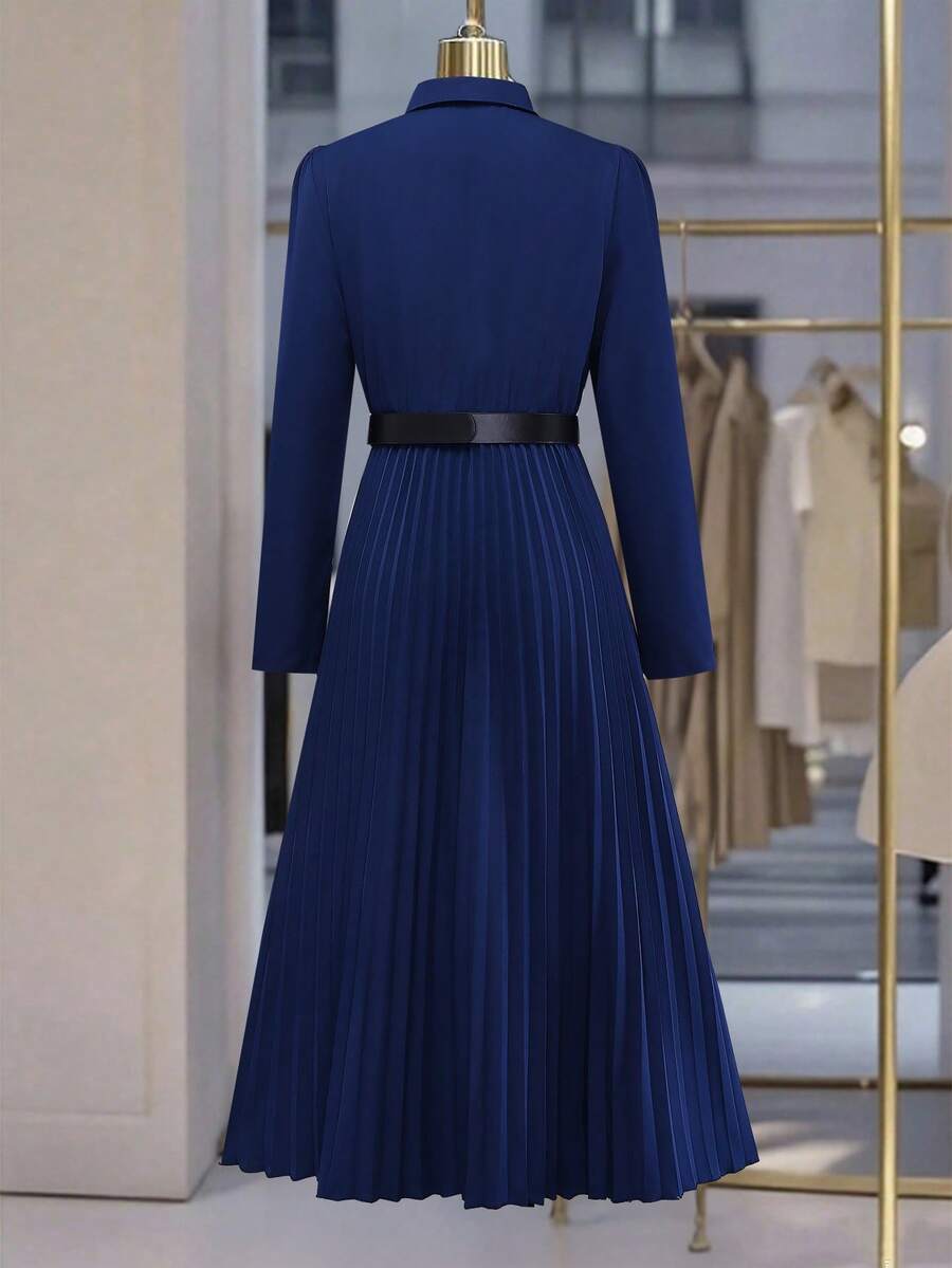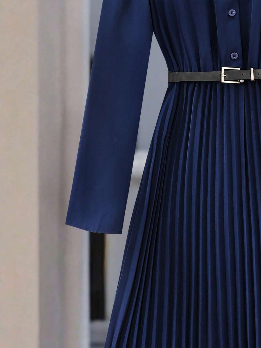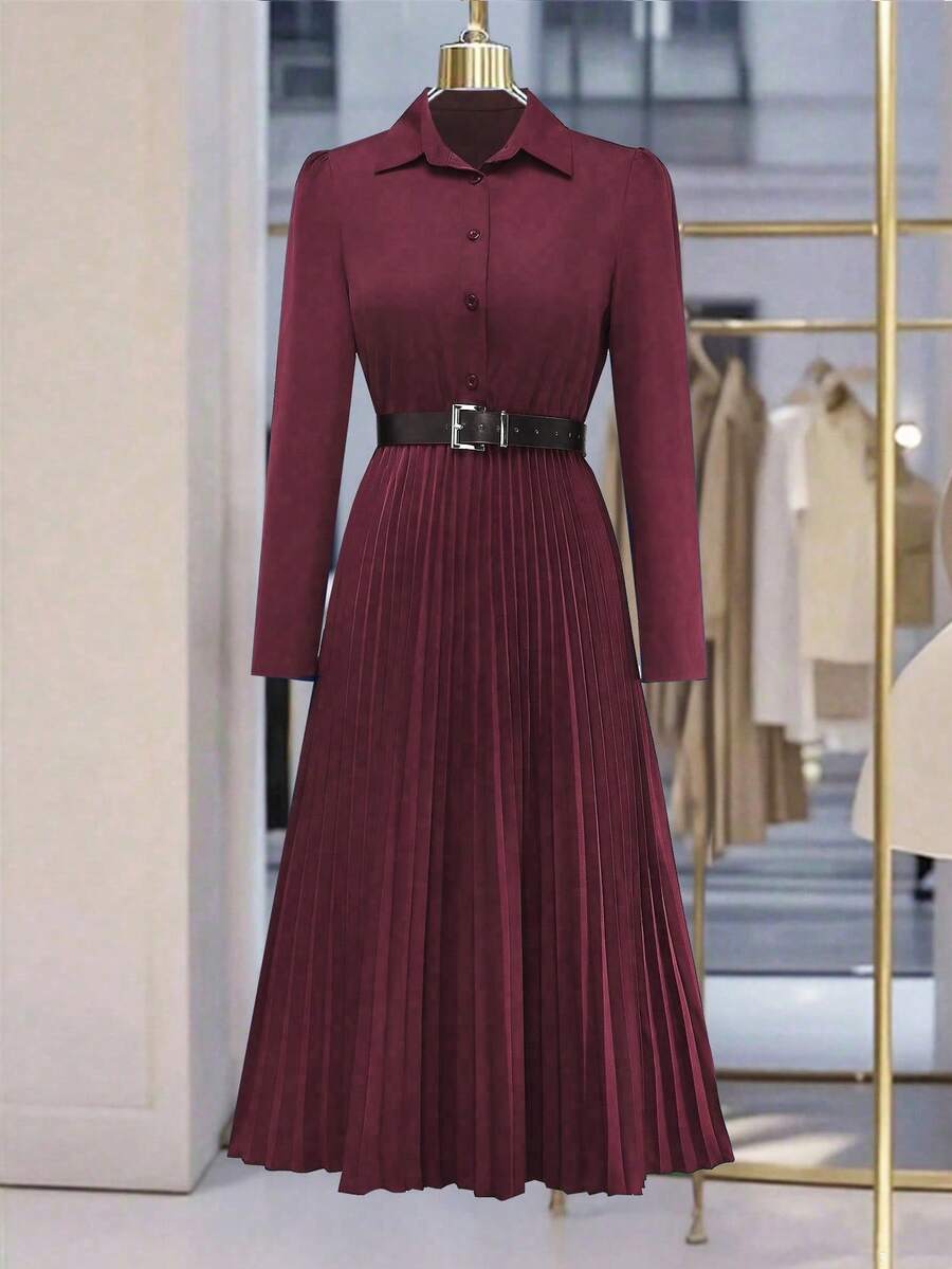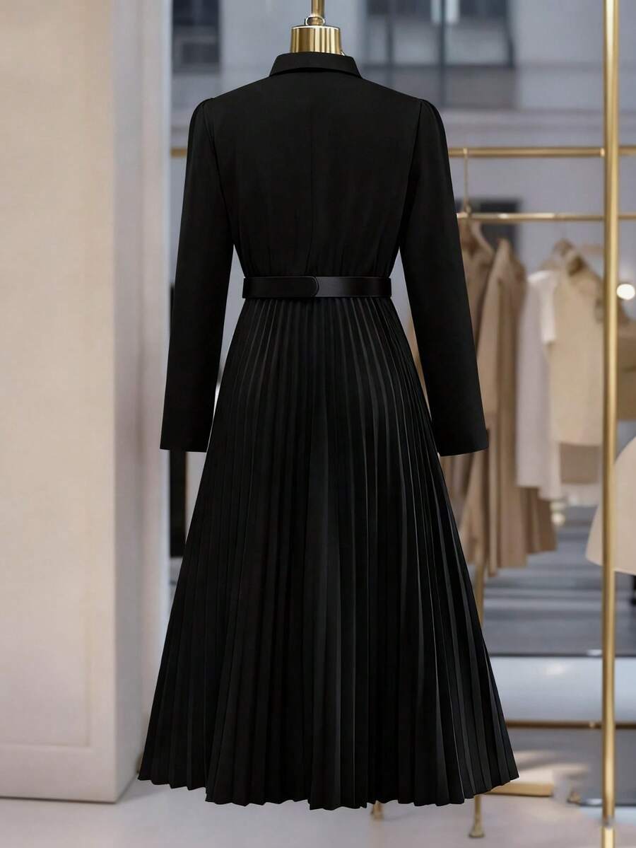 Vestido-camisa feminino elegante, plissado, de manga comprida e botões (cinto não incluído), outono